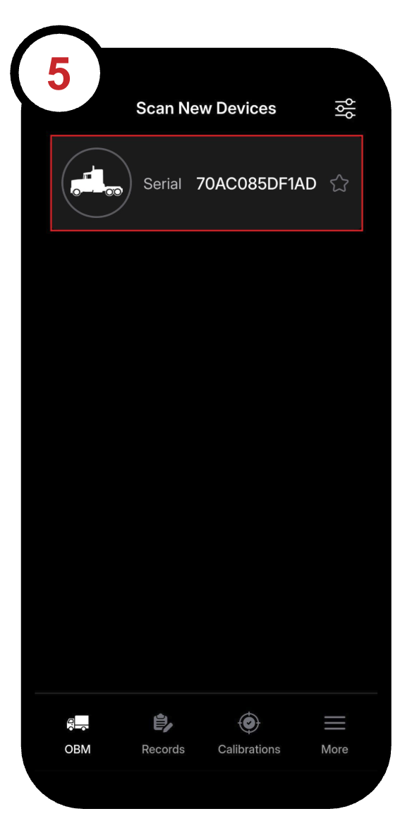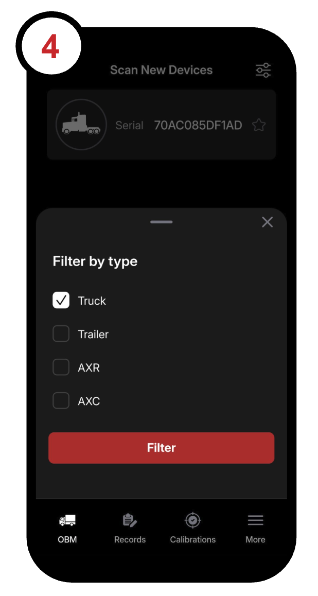 4. Filter by type to include the device you want to calibrate. Ensure the vehicle is powered on:
