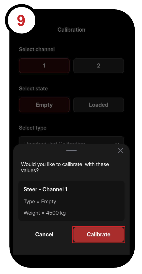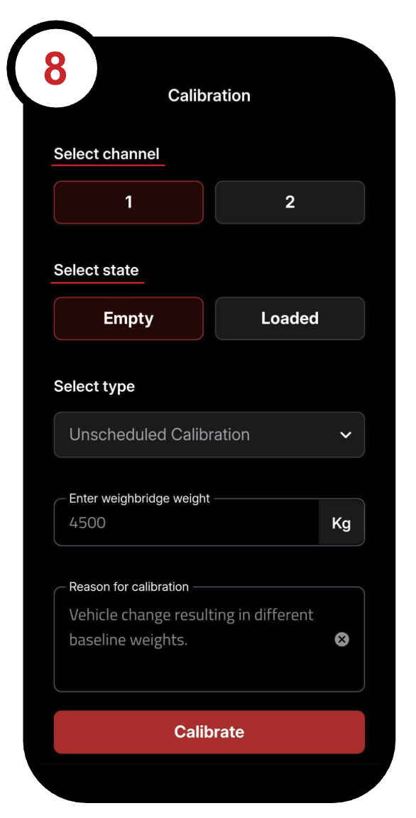8. Select the channel, state, and type of calibration you are performing. An unscheduled calibration type will require a note: