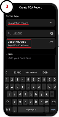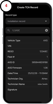 3. Tap the Record type drop down menu and select Installation record. Enter your vehicle registration, fleet number, or serial number and select the device when prompted.